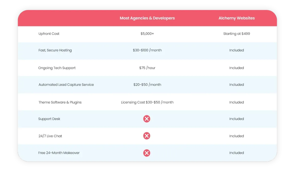 Keeping up with today’s online world is often a challenge for most businesses, but not with Alchemy Websites. We’ve got your back with monthly maintenance and a free website refresh every 24 months!